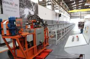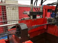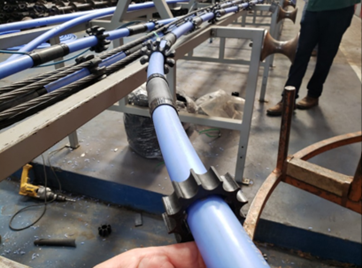 O processo divide-se em dois módulos integrados: Módulo 1 – Preparação e Encapsulamento das Cordoalhas: a máquina automatizada corta as cordoalhas conforme projeto, aplica proteção anticorrosiva (graxa ou cera) e encapsula com PEBD, de acordo com os critérios da NBR 5629 (ABNT, 2018), especialmente quanto à proteção anticorrosiva e ao encapsulamento.. Módulo 2 – Conformação e Montagem do Tubo de Injeção com Componentes Funcionais: paralelamente, ocorre o corte e furação do tubo de PEAD e a instalação de válvulas manchete, batentes direcionais e espaçadores em bancada auxiliar.