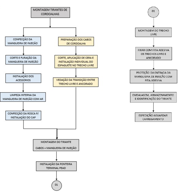 A implantação do processo industrial requer planejamento técnico e operacional. O fluxograma dos tirantes provisórios organiza as etapas de montagem segundo a lógica produtiva e layout fabril, otimizando ciclos, logística e qualidade, conforme princípios do Lean Manufacturing.