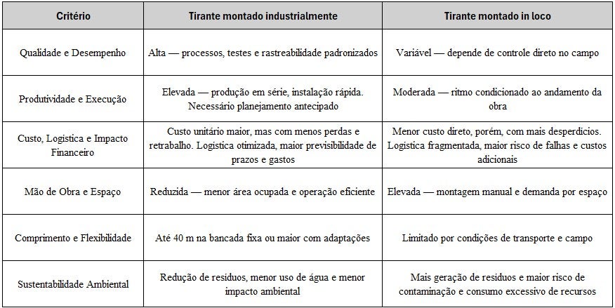 A seguir, apresenta-se uma tabela comparativa entre os métodos tradicional e industrializado de montagem de tirantes, com agrupamento de critérios para otimizar a apresentação dos principais aspectos técnicos, operacionais, ambientais e financeiros: